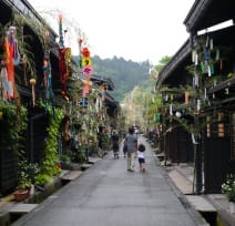 その中にある高山市は海抜573m、東西27.1km、南北11.5kmの細長い地形で、美しい自然と四季おりおりの変化に恵まれた山岳都市です。平成17年2月に1つの市と9つの町村が合併して、日本一面積の広い市となりました(140.47k㎡、東京都より広いのです!)。北の日本海に流れる宮川、南の太平洋へ流れる飛騨川沿いの小さな平地には、まとまった集落が広がり、支流の谷沿いにも小集落が多く散存していて、東に乗鞍岳、焼岳、穂高岳、槍ヶ岳、黒部五郎岳、笠ヶ岳、南東に御岳、北西に白山が遠望できる環境にあります。風光明媚なところが随所にあって、歴史ある街並みと共に古くから絵画や詩などで飛騨の自然美あふれる情景が表現されています。