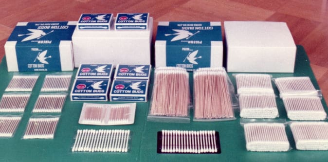 そんな国産綿棒も開業当初は国内需要がなく、ほとんどがヨーロッパや豪州への輸出用でしたが、昭和50年代以降になると急速に家庭に浸透していき、量産可能で安価なプラスチック綿棒、安全性の高い紙軸綿棒、赤ちゃんに便利な細軸綿棒、耳かき用の綿棒、そして当社が日本で初めて開発した耳アカの見やすいブラック綿棒など、用途ごとの綿棒が次々に発売され、現在に至っています。